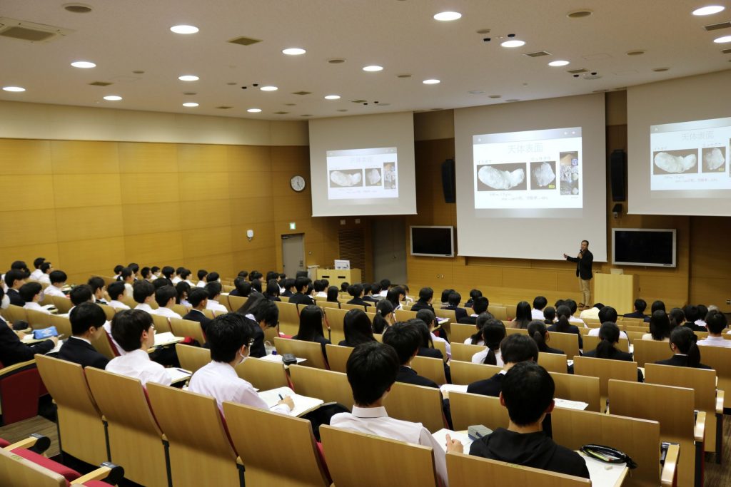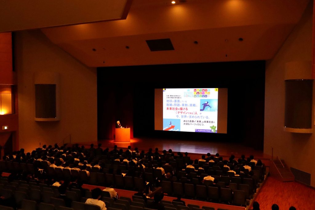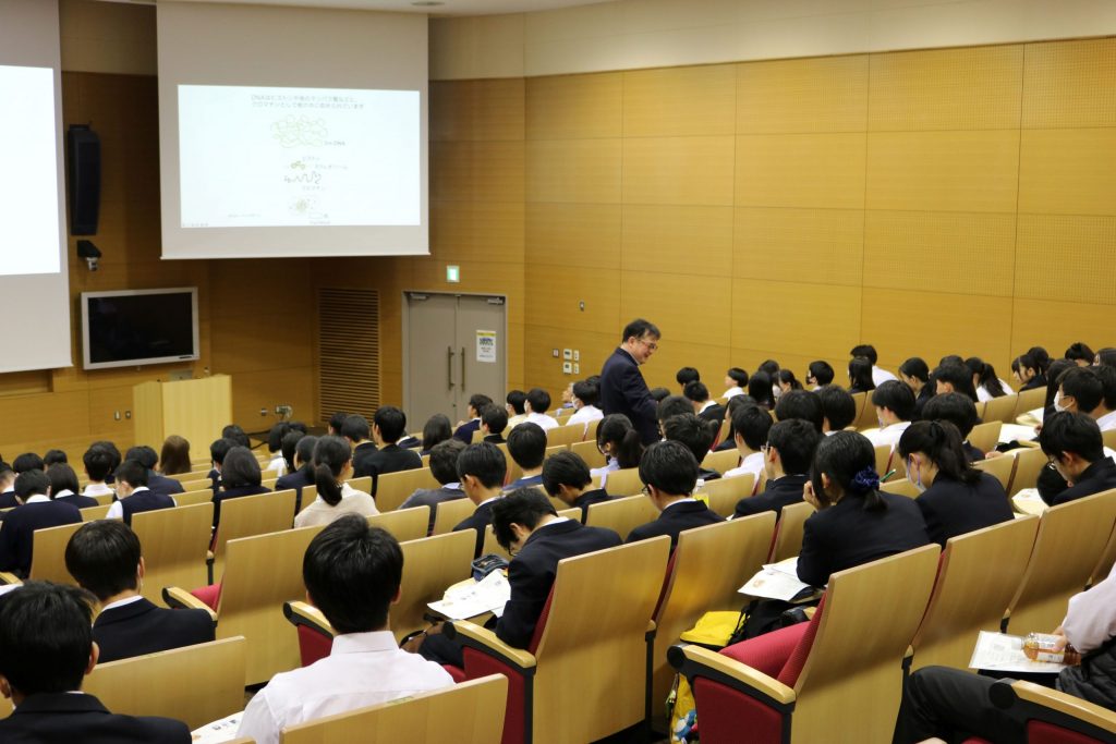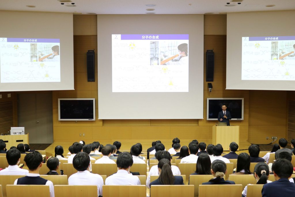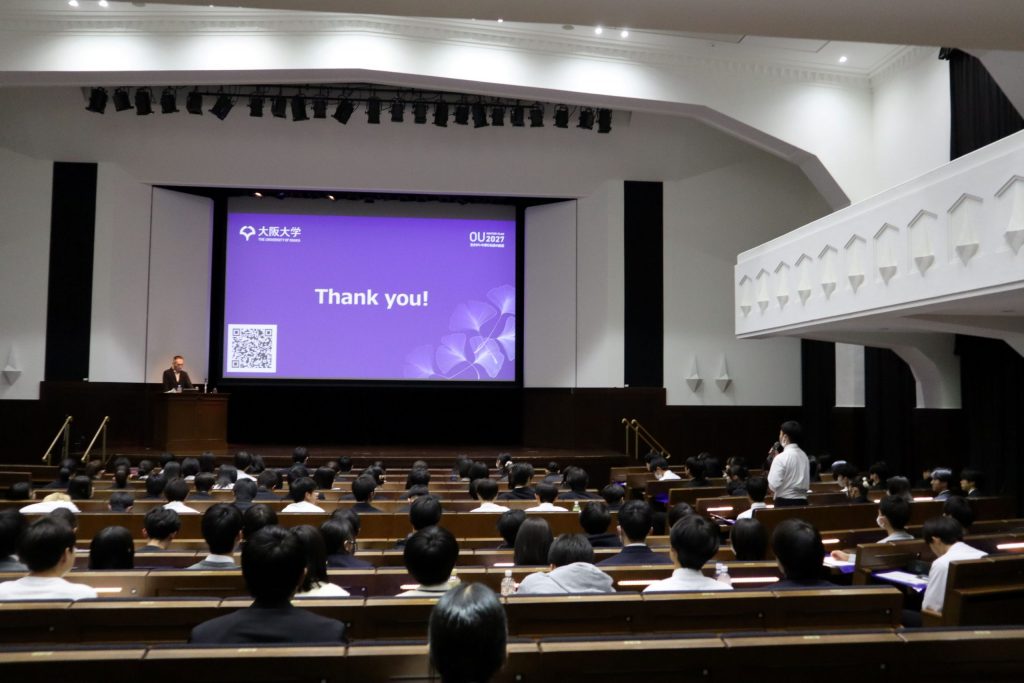 今年は、吹田キャンパス、豊中キャンパスに分かれて1、2年生約800名が受講しました。田中敏宏理事・副学長による大学概要説明の後、工学部、薬学部、法学部、経済学部、基礎工学部、理学部の6学部の講義と、昨年に引き続き工学研究科の大学院生による実験教室が行われました。