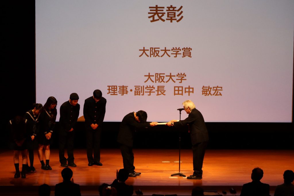最後に、大阪府教育委員会賞に四條畷高校、大阪大学賞に茨木高校が選ばれ、表彰状が授与された後、会は幕を閉じました。